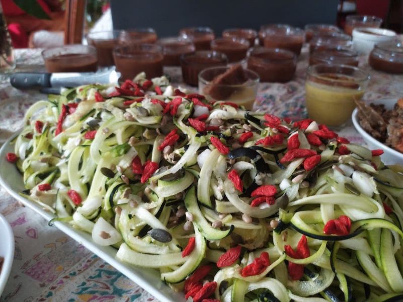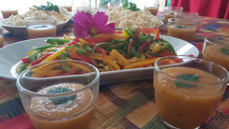 L'alimentation est donc végétarienne, à base de produits bio, en grande partie en alimentation vivante. Nos repas sont facilement adaptables aux régimes sans gluten, sans lactose ou vegan, n'hésitez pas à nous préciser vos besoins lors de votre inscription. Pendant les temps de pause vous seront proposés tisanes, thé et fruits.